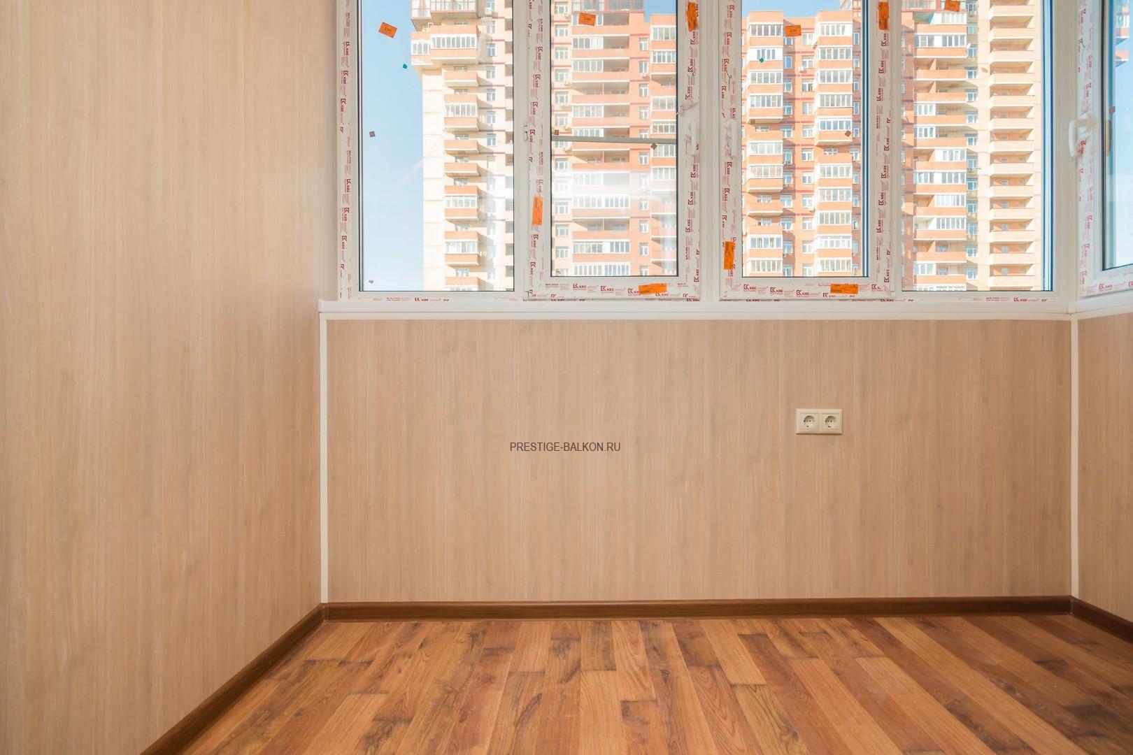 Проведено двухслойное утепление пола, потолка и всех стен контактирующих с улицей. Настелен черновой пол из фанеры с укладкой ламината на подложку. Проведена электрофикация лоджии с установкой розеток, выключателя и освещения. Обшиты стены и потолки пластиковыми ламинированными панелями. Работы проводились 2 дня бригадой из двух монтажников.
